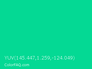 YUV 145.447,1.259,-124.049 Color is a normal green color and the nearest color is Caribbean Green #00cc99. Hex code #04d994 and RGB value is rgb(4,217,148). In RGB color space, this color is composed of 2% red, 85% green, 58% blue, In CMYK color space, this color is composed of 98% cyan, 0% magenta, 32% yellow , 15% black , In HSL color space, this color has a hue angle of 161° , 96% saturation and 43% lightness.