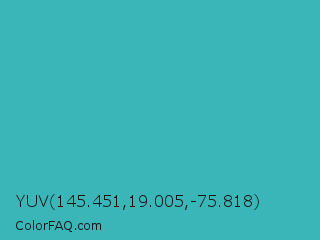 YUV 145.451,19.005,-75.818 Color is a normal cyan color and the nearest color is Verdigris #43b3ae. Hex code #3bb6b8 and RGB value is rgb(59,182,184). In RGB color space, this color is composed of 23% red, 71% green, 72% blue, In CMYK color space, this color is composed of 68% cyan, 1% magenta, 0% yellow , 28% black , In HSL color space, this color has a hue angle of 181° , 51% saturation and 48% lightness.
