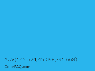 YUV 145.524,45.098,-91.668 Color is a normal blue color and the nearest color is Button Blue #24a0ed. Hex code #29b5ed and RGB value is rgb(41,181,237). In RGB color space, this color is composed of 16% red, 71% green, 93% blue, In CMYK color space, this color is composed of 83% cyan, 24% magenta, 0% yellow , 7% black , In HSL color space, this color has a hue angle of 197° , 84% saturation and 55% lightness.