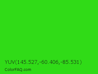 YUV 145.527,-60.406,-85.531 Color is a normal green color and the nearest color is Harlequin Green #46cb18. Hex code #30db17 and RGB value is rgb(48,219,23). In RGB color space, this color is composed of 19% red, 86% green, 9% blue, In CMYK color space, this color is composed of 78% cyan, 0% magenta, 89% yellow , 14% black , In HSL color space, this color has a hue angle of 112° , 81% saturation and 47% lightness.