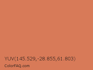 YUV 145.529,-28.855,61.803 Color is a normal orange color and the nearest color is Japonica #d87c63. Hex code #d87957 and RGB value is rgb(216,121,87). In RGB color space, this color is composed of 85% red, 47% green, 34% blue, In CMYK color space, this color is composed of 0% cyan, 44% magenta, 60% yellow , 15% black , In HSL color space, this color has a hue angle of 16° , 62% saturation and 59% lightness.