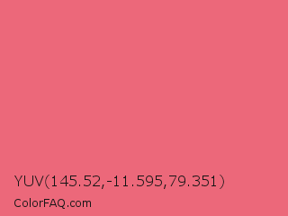 YUV 145.52,-11.595,79.351 Color is a light red color and the nearest color is Light Carmine Pink #e66771. Hex code #ec687a and RGB value is rgb(236,104,122). In RGB color space, this color is composed of 93% red, 41% green, 48% blue, In CMYK color space, this color is composed of 0% cyan, 56% magenta, 48% yellow , 7% black , In HSL color space, this color has a hue angle of 352° , 78% saturation and 67% lightness.