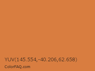 YUV 145.554,-40.206,62.658 Color is a normal orange color and the nearest color is Raw Sienna Crayola #d27d46. Hex code #d97d40 and RGB value is rgb(217,125,64). In RGB color space, this color is composed of 85% red, 49% green, 25% blue, In CMYK color space, this color is composed of 0% cyan, 42% magenta, 71% yellow , 15% black , In HSL color space, this color has a hue angle of 24° , 67% saturation and 55% lightness.