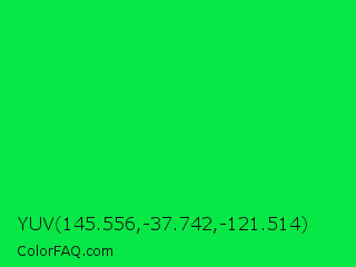 YUV 145.556,-37.742,-121.514 Color is a normal green color and the nearest color is Malachite #0bda51. Hex code #07e745 and RGB value is rgb(7,231,69). In RGB color space, this color is composed of 3% red, 91% green, 27% blue, In CMYK color space, this color is composed of 97% cyan, 0% magenta, 70% yellow , 9% black , In HSL color space, this color has a hue angle of 137° , 94% saturation and 47% lightness.