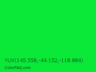YUV 145.558,-44.152,-118.884 Color is a normal green color and the nearest color is Malachite #0bda51. Hex code #0ae838 and RGB value is rgb(10,232,56). In RGB color space, this color is composed of 4% red, 91% green, 22% blue, In CMYK color space, this color is composed of 96% cyan, 0% magenta, 76% yellow , 9% black , In HSL color space, this color has a hue angle of 132° , 92% saturation and 47% lightness.