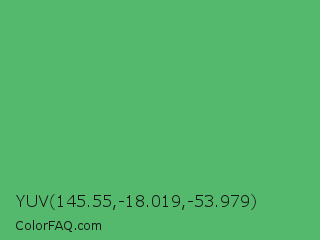 YUV 145.55,-18.019,-53.979 Color is a normal green color and the nearest color is Fern #63b76c. Hex code #54b86d and RGB value is rgb(84,184,109). In RGB color space, this color is composed of 33% red, 72% green, 43% blue, In CMYK color space, this color is composed of 54% cyan, 0% magenta, 41% yellow , 28% black , In HSL color space, this color has a hue angle of 135° , 41% saturation and 53% lightness.