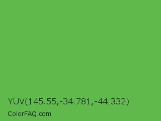 YUV 145.55,-34.781,-44.332 Color is a normal green color and the nearest color is Apple #4fa83d. Hex code #5fb94b and RGB value is rgb(95,185,75). In RGB color space, this color is composed of 37% red, 73% green, 29% blue, In CMYK color space, this color is composed of 49% cyan, 0% magenta, 59% yellow , 27% black , In HSL color space, this color has a hue angle of 109° , 44% saturation and 51% lightness.