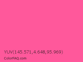 YUV 145.571,4.648,95.969 Color is a light rose color and the nearest color is Brilliant Rose #ff55a3. Hex code #ff589b and RGB value is rgb(255,88,155). In RGB color space, this color is composed of 100% red, 35% green, 61% blue, In CMYK color space, this color is composed of 0% cyan, 65% magenta, 39% yellow , 0% black , In HSL color space, this color has a hue angle of 336° , 100% saturation and 67% lightness.