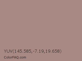 YUV 145.585,-7.19,19.658 Color is a normal red color and the nearest color is Sandrift #ab917a. Hex code #a88983 and RGB value is rgb(168,137,131). In RGB color space, this color is composed of 66% red, 54% green, 51% blue, In CMYK color space, this color is composed of 0% cyan, 18% magenta, 22% yellow , 34% black , In HSL color space, this color has a hue angle of 10° , 18% saturation and 59% lightness.