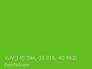 YUV 145.594,-55.016,-40.863 Color is a normal green color and the nearest color is Lima #76bd17. Hex code #63bf22 and RGB value is rgb(99,191,34). In RGB color space, this color is composed of 39% red, 75% green, 13% blue, In CMYK color space, this color is composed of 48% cyan, 0% magenta, 82% yellow , 25% black , In HSL color space, this color has a hue angle of 95° , 70% saturation and 44% lightness.