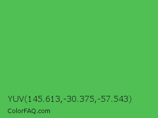 YUV 145.613,-30.375,-57.543 Color is a normal green color and the nearest color is Chateau Green #40a860. Hex code #50bf54 and RGB value is rgb(80,191,84). In RGB color space, this color is composed of 31% red, 75% green, 33% blue, In CMYK color space, this color is composed of 58% cyan, 0% magenta, 56% yellow , 25% black , In HSL color space, this color has a hue angle of 122° , 46% saturation and 53% lightness.