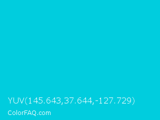 YUV 145.643,37.644,-127.729 Color is a normal cyan color and the nearest color is Dark Turquoise #00ced1. Hex code #00cdde and RGB value is rgb(0,205,222). In RGB color space, this color is composed of 0% red, 80% green, 87% blue, In CMYK color space, this color is composed of 100% cyan, 8% magenta, 0% yellow , 13% black , In HSL color space, this color has a hue angle of 185° , 100% saturation and 44% lightness.