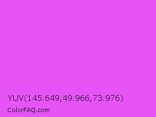 YUV 145.649,49.966,73.976 Color is a light magenta color and the nearest color is Pink Flamingo Crayola #ff66ff. Hex code #e653f7 and RGB value is rgb(230,83,247). In RGB color space, this color is composed of 90% red, 33% green, 97% blue, In CMYK color space, this color is composed of 7% cyan, 66% magenta, 0% yellow , 3% black , In HSL color space, this color has a hue angle of 294° , 91% saturation and 65% lightness.