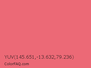 YUV 145.651,-13.632,79.236 Color is a light red color and the nearest color is Light Carmine Pink #e66771. Hex code #ec6976 and RGB value is rgb(236,105,118). In RGB color space, this color is composed of 93% red, 41% green, 46% blue, In CMYK color space, this color is composed of 0% cyan, 56% magenta, 50% yellow , 7% black , In HSL color space, this color has a hue angle of 354° , 78% saturation and 67% lightness.