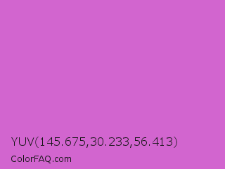 YUV 145.675,30.233,56.413 Color is a light magenta color and the nearest color is French Mauve #d473d4. Hex code #d265cf and RGB value is rgb(210,101,207). In RGB color space, this color is composed of 82% red, 40% green, 81% blue, In CMYK color space, this color is composed of 0% cyan, 52% magenta, 1% yellow , 18% black , In HSL color space, this color has a hue angle of 302° , 55% saturation and 61% lightness.