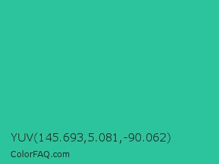 YUV 145.693,5.081,-90.062 Color is a normal cyan color and the nearest color is Shamrock #33cc99. Hex code #2bc49c and RGB value is rgb(43,196,156). In RGB color space, this color is composed of 17% red, 77% green, 61% blue, In CMYK color space, this color is composed of 78% cyan, 0% magenta, 20% yellow , 23% black , In HSL color space, this color has a hue angle of 164° , 64% saturation and 47% lightness.