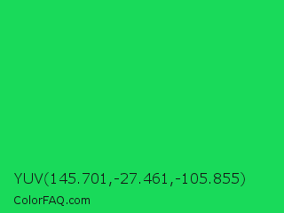 YUV 145.701,-27.461,-105.855 Color is a normal green color and the nearest color is Malachite #0bda51. Hex code #19da5a and RGB value is rgb(25,218,90). In RGB color space, this color is composed of 10% red, 85% green, 35% blue, In CMYK color space, this color is composed of 89% cyan, 0% magenta, 59% yellow , 15% black , In HSL color space, this color has a hue angle of 140° , 79% saturation and 48% lightness.