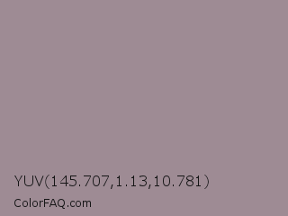 YUV 145.707,1.13,10.781 Color is a normal rose color and the nearest color is Mountain Mist #959396. Hex code #9e8b94 and RGB value is rgb(158,139,148). In RGB color space, this color is composed of 62% red, 55% green, 58% blue, In CMYK color space, this color is composed of 0% cyan, 12% magenta, 6% yellow , 38% black , In HSL color space, this color has a hue angle of 332° , 9% saturation and 58% lightness.