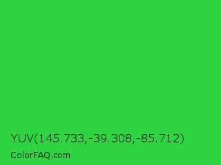 YUV 145.733,-39.308,-85.712 Color is a normal green color and the nearest color is Lime Green #32cd32. Hex code #30d342 and RGB value is rgb(48,211,66). In RGB color space, this color is composed of 19% red, 83% green, 26% blue, In CMYK color space, this color is composed of 77% cyan, 0% magenta, 69% yellow , 17% black , In HSL color space, this color has a hue angle of 127° , 65% saturation and 51% lightness.