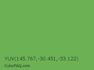 YUV 145.767,-30.451,-33.122 Color is a normal green color and the nearest color is Bud Green #7bb661. Hex code #6cb154 and RGB value is rgb(108,177,84). In RGB color space, this color is composed of 42% red, 69% green, 33% blue, In CMYK color space, this color is composed of 39% cyan, 0% magenta, 53% yellow , 31% black , In HSL color space, this color has a hue angle of 105° , 37% saturation and 51% lightness.