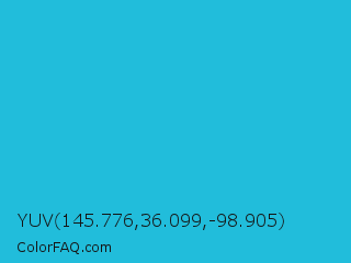 YUV 145.776,36.099,-98.905 Color is a normal cyan color and the nearest color is Scooter #2ebfd4. Hex code #21bddb and RGB value is rgb(33,189,219). In RGB color space, this color is composed of 13% red, 74% green, 86% blue, In CMYK color space, this color is composed of 85% cyan, 14% magenta, 0% yellow , 14% black , In HSL color space, this color has a hue angle of 190° , 74% saturation and 49% lightness.
