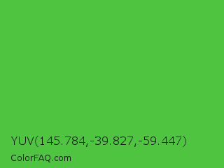YUV 145.784,-39.827,-59.447 Color is a normal green color and the nearest color is Apple #4fa83d. Hex code #4ec441 and RGB value is rgb(78,196,65). In RGB color space, this color is composed of 31% red, 77% green, 25% blue, In CMYK color space, this color is composed of 60% cyan, 0% magenta, 67% yellow , 23% black , In HSL color space, this color has a hue angle of 114° , 53% saturation and 51% lightness.
