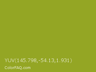 YUV 145.798,-54.13,1.931 Color is a normal yellow color and the nearest color is Citron #9fa91f. Hex code #94a624 and RGB value is rgb(148,166,36). In RGB color space, this color is composed of 58% red, 65% green, 14% blue, In CMYK color space, this color is composed of 11% cyan, 0% magenta, 78% yellow , 35% black , In HSL color space, this color has a hue angle of 68° , 64% saturation and 40% lightness.