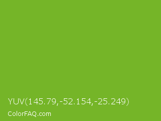 YUV 145.79,-52.154,-25.249 Color is a normal green color and the nearest color is Green RYB #66b032. Hex code #75b528 and RGB value is rgb(117,181,40). In RGB color space, this color is composed of 46% red, 71% green, 16% blue, In CMYK color space, this color is composed of 35% cyan, 0% magenta, 78% yellow , 29% black , In HSL color space, this color has a hue angle of 87° , 64% saturation and 43% lightness.