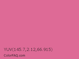 YUV 145.7,2.12,66.915 Color is a light rose color and the nearest color is Pale Red Violet #db7093. Hex code #de6a96 and RGB value is rgb(222,106,150). In RGB color space, this color is composed of 87% red, 42% green, 59% blue, In CMYK color space, this color is composed of 0% cyan, 52% magenta, 32% yellow , 13% black , In HSL color space, this color has a hue angle of 337° , 64% saturation and 64% lightness.