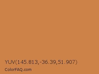YUV 145.813,-36.39,51.907 Color is a normal orange color and the nearest color is Raw Sienna Crayola #d27d46. Hex code #cd8248 and RGB value is rgb(205,130,72). In RGB color space, this color is composed of 80% red, 51% green, 28% blue, In CMYK color space, this color is composed of 0% cyan, 37% magenta, 65% yellow , 20% black , In HSL color space, this color has a hue angle of 26° , 57% saturation and 54% lightness.