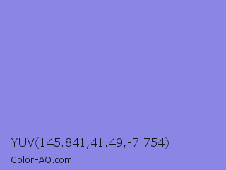 YUV 145.841,41.49,-7.754 Color is a light indigo color and the nearest color is Chetwode Blue #8581d9. Hex code #8986e6 and RGB value is rgb(137,134,230). In RGB color space, this color is composed of 54% red, 53% green, 90% blue, In CMYK color space, this color is composed of 40% cyan, 42% magenta, 0% yellow , 10% black , In HSL color space, this color has a hue angle of 242° , 66% saturation and 71% lightness.