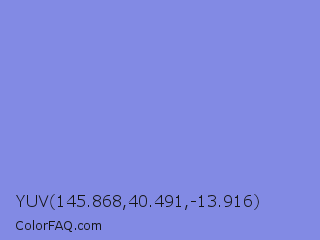 YUV 145.868,40.491,-13.916 Color is a light blue color and the nearest color is Chetwode Blue #8581d9. Hex code #828ae4 and RGB value is rgb(130,138,228). In RGB color space, this color is composed of 51% red, 54% green, 89% blue, In CMYK color space, this color is composed of 43% cyan, 39% magenta, 0% yellow , 11% black , In HSL color space, this color has a hue angle of 235° , 64% saturation and 70% lightness.