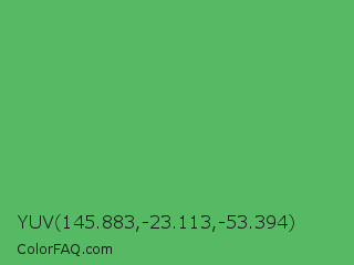 YUV 145.883,-23.113,-53.394 Color is a normal green color and the nearest color is Fern #63b76c. Hex code #55ba63 and RGB value is rgb(85,186,99). In RGB color space, this color is composed of 33% red, 73% green, 39% blue, In CMYK color space, this color is composed of 54% cyan, 0% magenta, 47% yellow , 27% black , In HSL color space, this color has a hue angle of 128° , 42% saturation and 53% lightness.