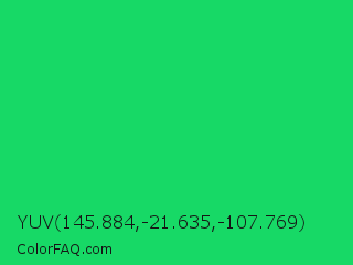 YUV 145.884,-21.635,-107.769 Color is a normal green color and the nearest color is Malachite #0bda51. Hex code #17d966 and RGB value is rgb(23,217,102). In RGB color space, this color is composed of 9% red, 85% green, 40% blue, In CMYK color space, this color is composed of 89% cyan, 0% magenta, 53% yellow , 15% black , In HSL color space, this color has a hue angle of 144° , 81% saturation and 47% lightness.