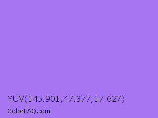 YUV 145.901,47.377,17.627 Color is a light violet color and the nearest color is Lavender #b57edc. Hex code #a675f2 and RGB value is rgb(166,117,242). In RGB color space, this color is composed of 65% red, 46% green, 95% blue, In CMYK color space, this color is composed of 31% cyan, 52% magenta, 0% yellow , 5% black , In HSL color space, this color has a hue angle of 264° , 83% saturation and 70% lightness.