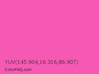 YUV 145.904,16.316,86.907 Color is a light magenta color and the nearest color is Brilliant Rose #f653a6. Hex code #f559b3 and RGB value is rgb(245,89,179). In RGB color space, this color is composed of 96% red, 35% green, 70% blue, In CMYK color space, this color is composed of 0% cyan, 64% magenta, 27% yellow , 4% black , In HSL color space, this color has a hue angle of 325° , 89% saturation and 65% lightness.