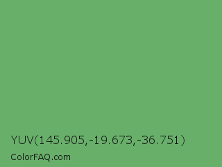 YUV 145.905,-19.673,-36.751 Color is a normal green color and the nearest color is Fern #63b76c. Hex code #68af6a and RGB value is rgb(104,175,106). In RGB color space, this color is composed of 41% red, 69% green, 42% blue, In CMYK color space, this color is composed of 41% cyan, 0% magenta, 39% yellow , 31% black , In HSL color space, this color has a hue angle of 122° , 31% saturation and 55% lightness.