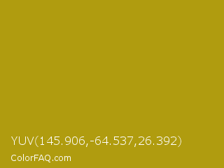 YUV 145.906,-64.537,26.392 Color is a normal yellow color and the nearest color is Sahara #b7a214. Hex code #b09c0f and RGB value is rgb(176,156,15). In RGB color space, this color is composed of 69% red, 61% green, 6% blue, In CMYK color space, this color is composed of 0% cyan, 11% magenta, 91% yellow , 31% black , In HSL color space, this color has a hue angle of 53° , 84% saturation and 37% lightness.