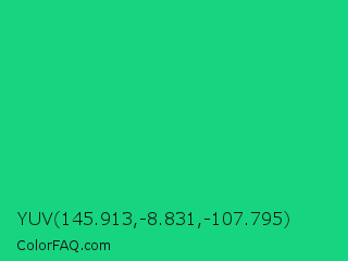 YUV 145.913,-8.831,-107.795 Color is a normal green color and the nearest color is Mountain Meadow Crayola #1ab385. Hex code #17d480 and RGB value is rgb(23,212,128). In RGB color space, this color is composed of 9% red, 83% green, 50% blue, In CMYK color space, this color is composed of 89% cyan, 0% magenta, 40% yellow , 17% black , In HSL color space, this color has a hue angle of 153° , 80% saturation and 46% lightness.