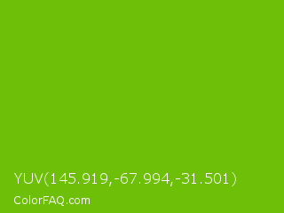 YUV 145.919,-67.994,-31.501 Color is a normal green color and the nearest color is Lima #76bd17. Hex code #6ebf08 and RGB value is rgb(110,191,8). In RGB color space, this color is composed of 43% red, 75% green, 3% blue, In CMYK color space, this color is composed of 42% cyan, 0% magenta, 96% yellow , 25% black , In HSL color space, this color has a hue angle of 87° , 92% saturation and 39% lightness.