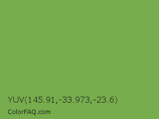 YUV 145.91,-33.973,-23.6 Color is a normal green color and the nearest color is Asparagus Green #7ba05b. Hex code #77ad4d and RGB value is rgb(119,173,77). In RGB color space, this color is composed of 47% red, 68% green, 30% blue, In CMYK color space, this color is composed of 31% cyan, 0% magenta, 55% yellow , 32% black , In HSL color space, this color has a hue angle of 94° , 38% saturation and 49% lightness.