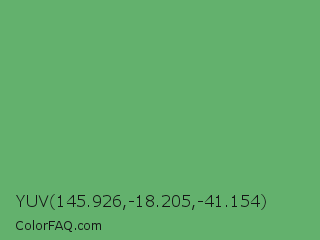 YUV 145.926,-18.205,-41.154 Color is a normal green color and the nearest color is Fern #63b76c. Hex code #63b16d and RGB value is rgb(99,177,109). In RGB color space, this color is composed of 39% red, 69% green, 43% blue, In CMYK color space, this color is composed of 44% cyan, 0% magenta, 38% yellow , 31% black , In HSL color space, this color has a hue angle of 128° , 33% saturation and 54% lightness.