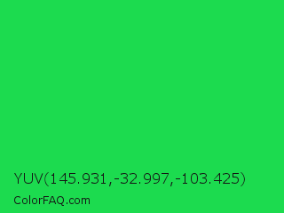 YUV 145.931,-32.997,-103.425 Color is a normal green color and the nearest color is Malachite #0bda51. Hex code #1cdb4f and RGB value is rgb(28,219,79). In RGB color space, this color is composed of 11% red, 86% green, 31% blue, In CMYK color space, this color is composed of 87% cyan, 0% magenta, 64% yellow , 14% black , In HSL color space, this color has a hue angle of 136° , 77% saturation and 48% lightness.