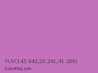 YUV 145.943,20.241,41.269 Color is a normal magenta color and the nearest color is Sky Magenta #cf71af. Hex code #c172bb and RGB value is rgb(193,114,187). In RGB color space, this color is composed of 76% red, 45% green, 73% blue, In CMYK color space, this color is composed of 0% cyan, 41% magenta, 3% yellow , 24% black , In HSL color space, this color has a hue angle of 305° , 39% saturation and 60% lightness.