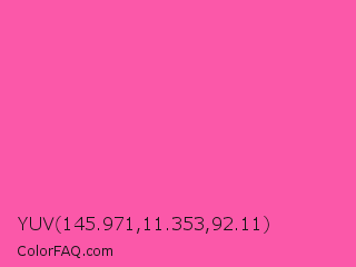 YUV 145.971,11.353,92.11 Color is a light rose color and the nearest color is Brilliant Rose #f653a6. Hex code #fb58a9 and RGB value is rgb(251,88,169). In RGB color space, this color is composed of 98% red, 35% green, 66% blue, In CMYK color space, this color is composed of 0% cyan, 65% magenta, 33% yellow , 2% black , In HSL color space, this color has a hue angle of 330° , 95% saturation and 66% lightness.