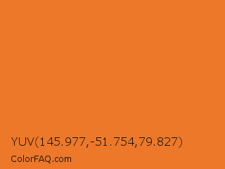 YUV 145.977,-51.754,79.827 Color is a normal orange color and the nearest color is Vivid Tangelo #f07427. Hex code #ed7829 and RGB value is rgb(237,120,41). In RGB color space, this color is composed of 93% red, 47% green, 16% blue, In CMYK color space, this color is composed of 0% cyan, 49% magenta, 83% yellow , 7% black , In HSL color space, this color has a hue angle of 24° , 84% saturation and 55% lightness.