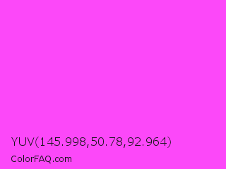 YUV 145.998,50.78,92.964 Color is a light magenta color and the nearest color is Pink Flamingo Crayola #ff66ff. Hex code #fc48f9 and RGB value is rgb(252,72,249). In RGB color space, this color is composed of 99% red, 28% green, 98% blue, In CMYK color space, this color is composed of 0% cyan, 71% magenta, 1% yellow , 1% black , In HSL color space, this color has a hue angle of 301° , 97% saturation and 64% lightness.