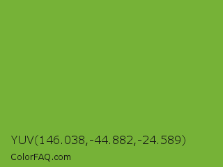 YUV 146.038,-44.882,-24.589 Color is a normal green color and the nearest color is Green RYB #66b032. Hex code #76b237 and RGB value is rgb(118,178,55). In RGB color space, this color is composed of 46% red, 70% green, 22% blue, In CMYK color space, this color is composed of 34% cyan, 0% magenta, 69% yellow , 30% black , In HSL color space, this color has a hue angle of 89° , 53% saturation and 46% lightness.