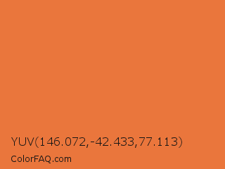 YUV 146.072,-42.433,77.113 Color is a normal orange color and the nearest color is Mandarin #f37a48. Hex code #ea763c and RGB value is rgb(234,118,60). In RGB color space, this color is composed of 92% red, 46% green, 24% blue, In CMYK color space, this color is composed of 0% cyan, 50% magenta, 74% yellow , 8% black , In HSL color space, this color has a hue angle of 20° , 81% saturation and 58% lightness.