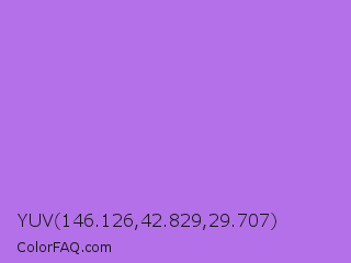 YUV 146.126,42.829,29.707 Color is a light purple color and the nearest color is Lavender #b57edc. Hex code #b470e9 and RGB value is rgb(180,112,233). In RGB color space, this color is composed of 71% red, 44% green, 91% blue, In CMYK color space, this color is composed of 23% cyan, 52% magenta, 0% yellow , 9% black , In HSL color space, this color has a hue angle of 274° , 73% saturation and 68% lightness.